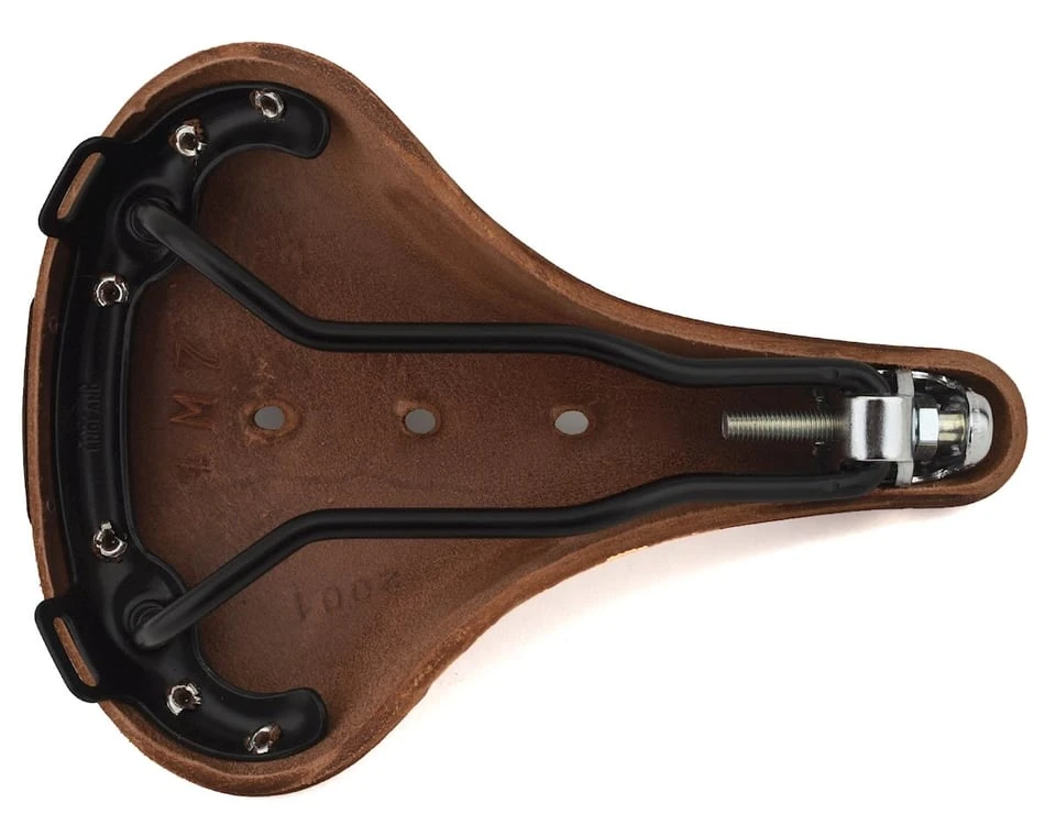 This is the Brook Saddle B17 S Standard Women’s Saddle. The B17 is Brooks’ flagship model, ideal for long distance sports touring, trekking and all-terrain use. It has been on the market for over 100 years, being featured in as early as the 1898 catalogue. The model is available for gents and ladies: the B17 (gents) and B17 S (ladies). The Standard models feature black steel rails, the B17 Special features copper plated steel metalwork, and the B17 Titanium. Both the B17 Special and the Titanium also feature hand hammered copper rivets.