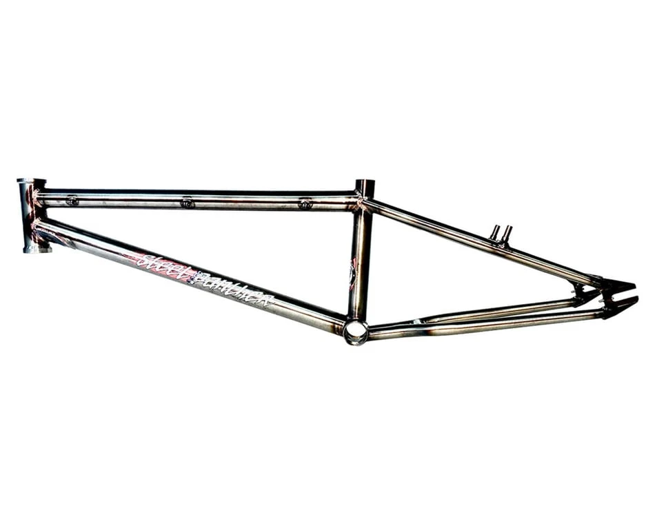 The S&M Steel Panther Race Frame is ready for prowling BMX tracks, easily preying on weaker Asian varieties, the American Steel Panther is King of the chromoly race frame jungle. And unlike it’s predecessors the .38 Special and Speedwagon, it’s not named after a cheesy rock band from the 80’s. Some notable improvements from the Speedwagon include: Additional bend in seat-stays for greater chain clearance, integrated chain tensioners in drops and slightly lower stand-over. Rear-end length depends on Top Tube length.